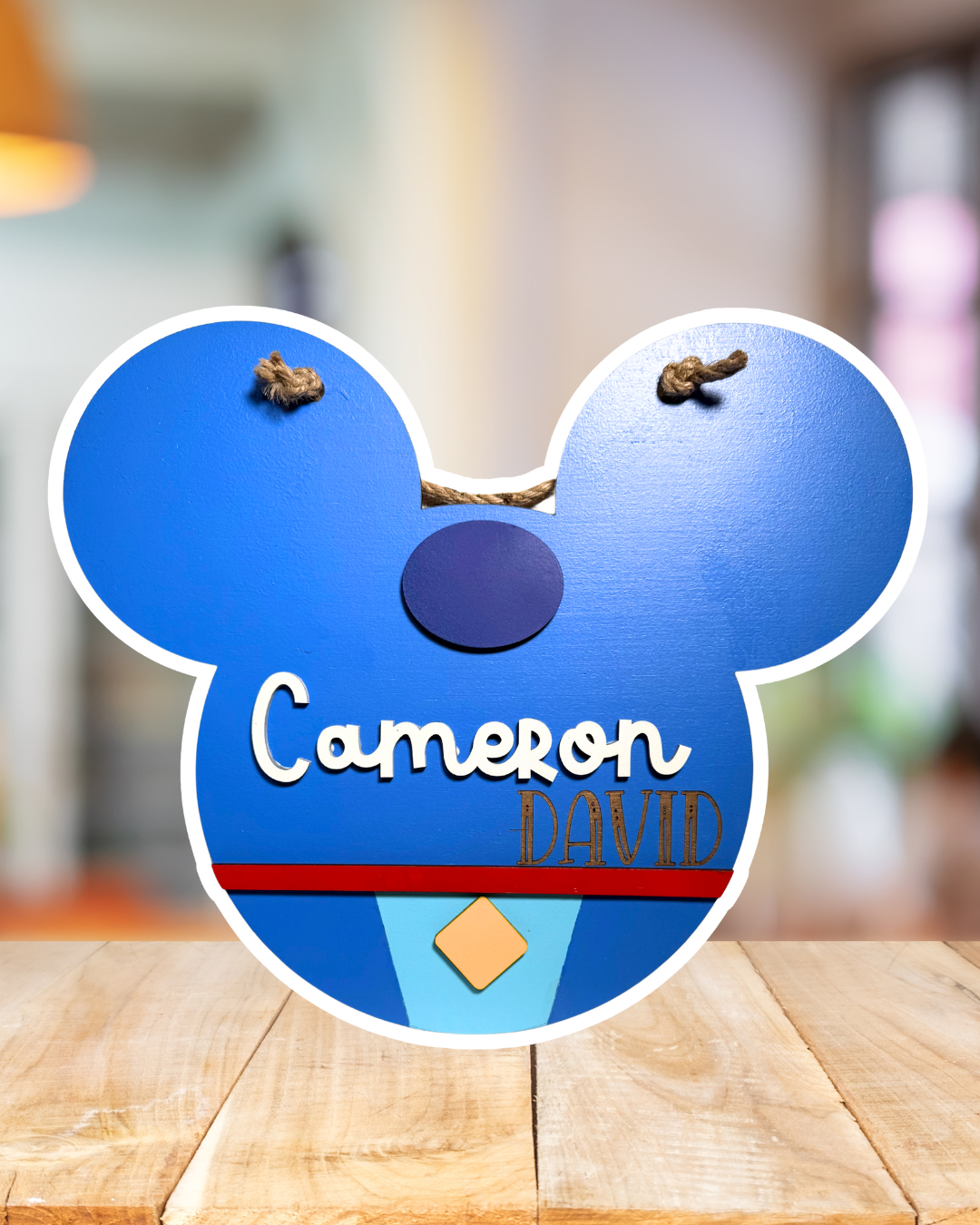 This personalized mouse-head sign is made to bring a little park-inspired magic to your favorite space. Each one is handmade with layered cut-out letters for the first name, an engraved middle name, and finished with playful color details. A rope hanger is included for easy display. Whether it’s a gift, a door sign, or a surprise in their Easter basket, this piece is full of heart and made just for you.