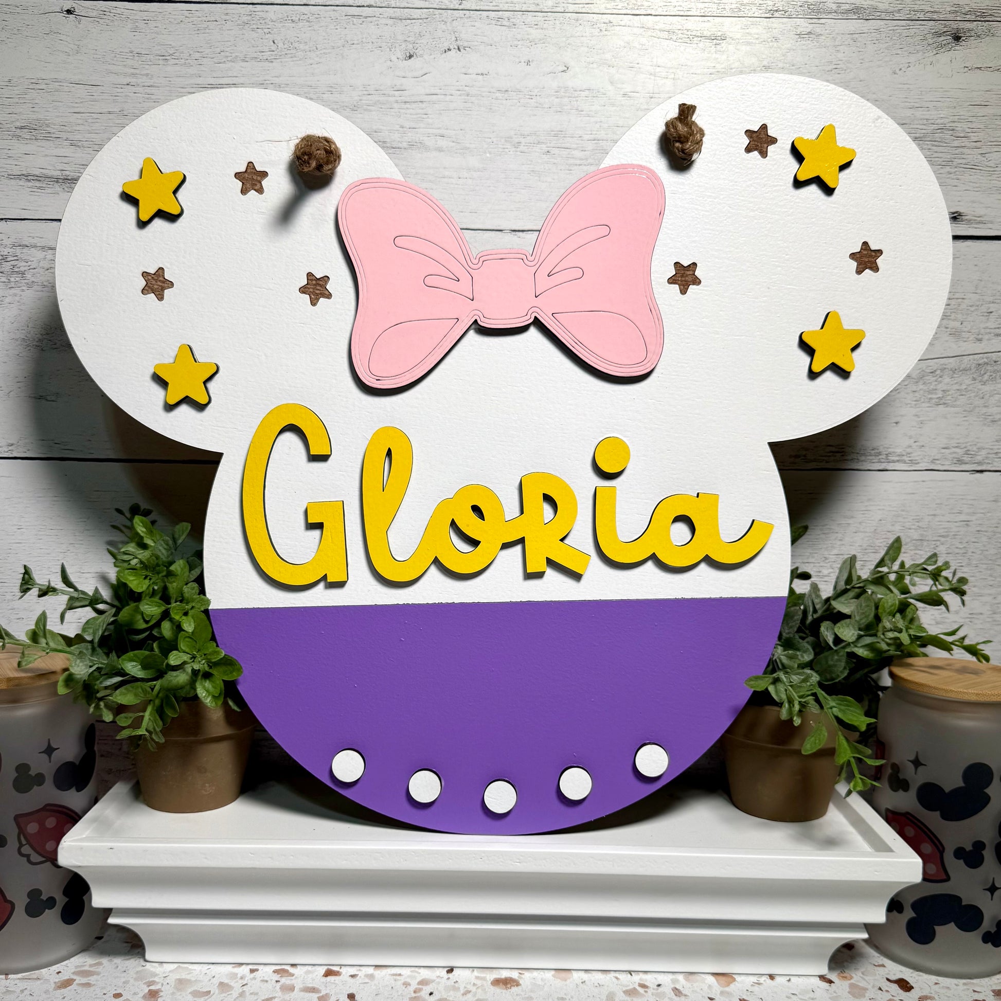 This personalized mouse-head sign is made to bring a little park-inspired magic to your favorite space. Each one is handmade with layered cut-out letters for the first name, an engraved middle name, and finished with playful color details. A rope hanger is included for easy display. Whether it’s a gift, a door sign, or a surprise in their Easter basket, this piece is full of heart and made just for you.