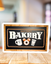 Framed signs: Sanded plywood with hand-painted background, framed in stained wood.